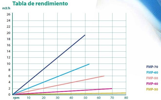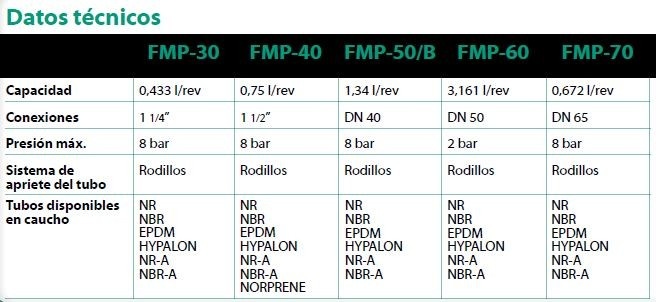 Caudales desde 100 a 44.000 l/h, diversas posibilidades de accionamiento a velocidad fija o variable, con posibilidad de elegir diversos tipos de conexiones a tubería.Sistema de apriete del tubo por rodillos con rodamientos a bola y lubricación de la manguera por una pequeña aportación de grasa de silicona.