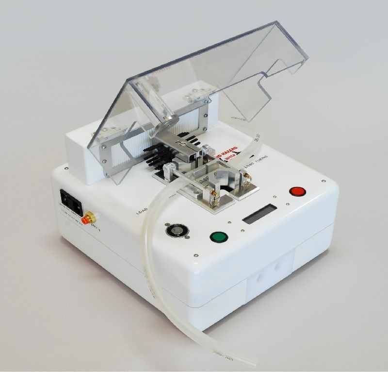 Opera con corriente eléctrica de 110 o 230 volt y utiliza aire filtrado. El soldador pesa solo 11.4kg, por eso puede ser fácilmente movilizada a través de la sala. La unidad es fácil para cargar y un panel LCD guía al usuario a través de la carga, soldadura y liberación de segmentos durante el ciclo. Al igual que el sellador opera solo con dos botones de control. Un interruptor de emergencia ‘corta’ la operación y está incorporado por razones de seguridad. El tiempo de soldadura varía desde los 2 y hasta 4 minutos dependiendo del diámetro interno y externo de la manguera. Las cuchillas de acero inoxidable de uso simple se proveen con la unidad y se pueden volver a solicitar cuando se necesiten.